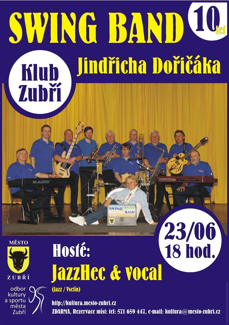 Sobota 23. 6. 2018 od 18.00 hodin 10 LET SWING BANDU JINDŘICHA DOŘIČÁKA Hosté: JazzHec & vocal (jazz, Vsetín) Místenky je možné rezervovat v kanceláři Klubu Zubří. Tel: 571 659 447, 602 483 785