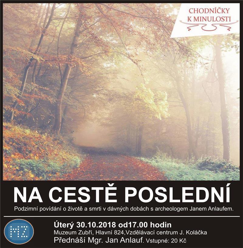 Na cestě poslední Mgr. Jan Anlauf Co bude na konci naší pozemské pouti a kam se vydá člověk dál? To je zřejmě nejstarší otázka, kterou si lidé kladou od úsvitu věků. Jak uctívali své mrtvé lovci mamutů a kdo byl pohřben v pravěkých mohylách? Jak přemáhali strach z mrtvých lidé ve středověku a kdo tančil tance mrtvých? A co nám prozradí nalezené kosti o životě našich předků? Podzimní povídání o životě a smrti v dávných dobách s archeologem Janem Anlaufem. Úterý 30. října od 17:00 hodin Vzdělávací centrum Jana Koláčka, Muzeum Zubří, Hlavní ul.