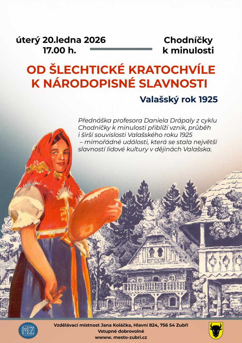 Přednáška profesora Daniel Drápala z cyklu Chodníčky k minulosti vás zavede k Valašskému roku 1925 – výjimečné události, která spojila tradice, folklor a regionální hrdost. Přijďte si poslechnout příběh slavnosti, jež dodnes patří k nejvýznamnějším mezníkům valašské kulturní historie.