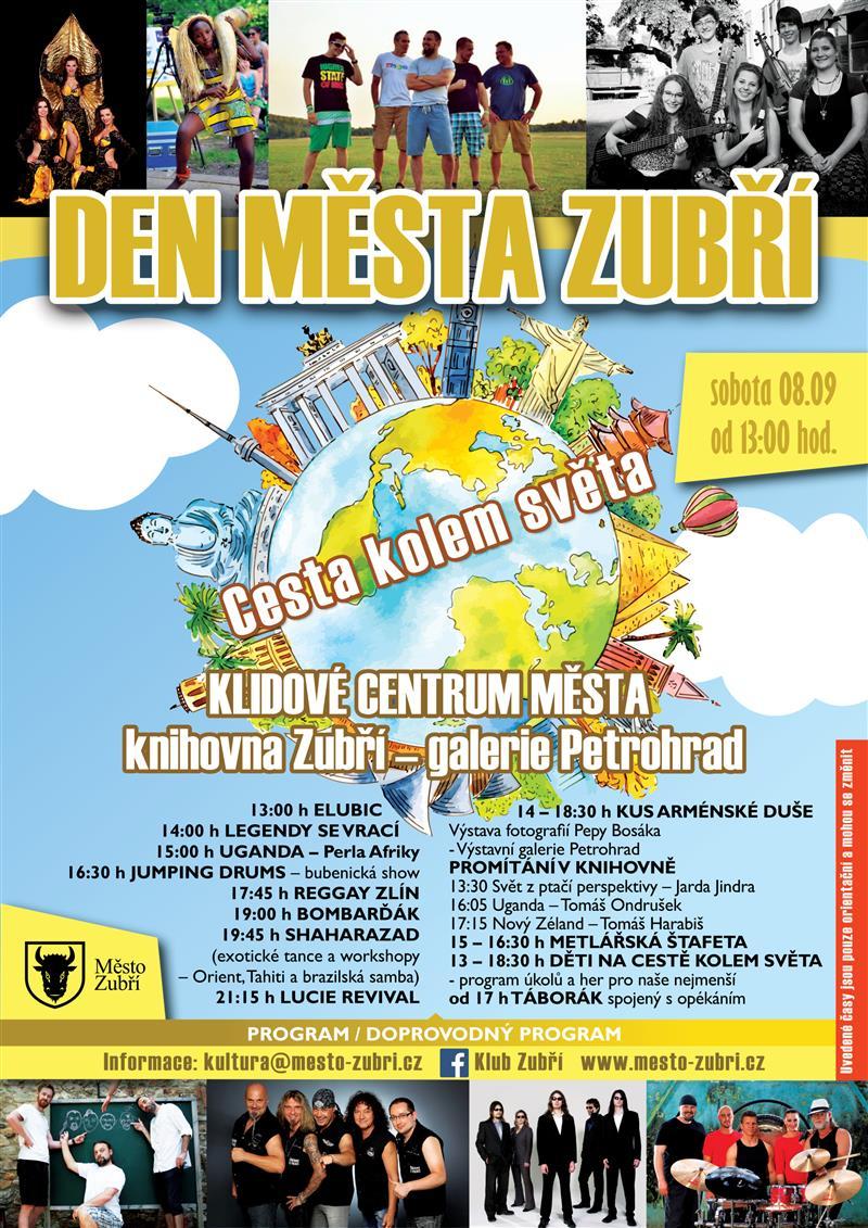 sobota 08.09. od 13:00 hodin DEN MĚSTA ZUBŘÍ CESTA KOLEM SVĚTA Indiánské týpí, fotografie s vůní dálek, ugandský čaj, orientální tanečnice a všudypřítomné rytmy a melodie z celého světa, takový bude letošní Den města Zubří. Aspoň na chvíli zapomeňte na místní folklor, tradice a zvyky a vydejte se za zážitky na CESTU KOLEM SVĚTA. Nebojte se, víme, že je všude dobře, ale doma nejlépe. Celou cestu tak začínáme a končíme v České republice. Můžete se proto mimo velkou porci exotiky těšit také na náš Elubic nebo fantastický revival legendární Lucie.
