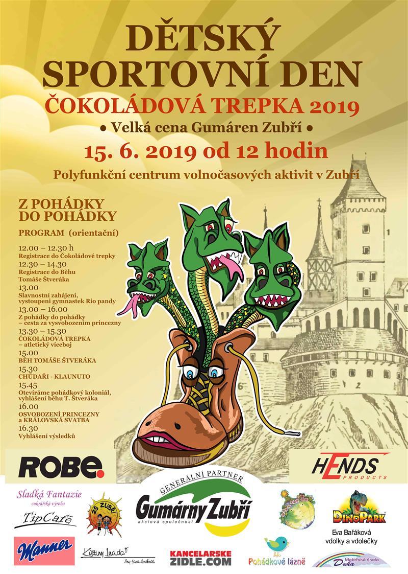 Sobota 15. 6. 2019 od 12 hodin DĚTSKÝ SPORTOVNÍ DEN – Z POHÁDKY DO POHÁDKY ČOKOLÁDOVÁ TREPKA 7. ročník dětského dne plného sportu, zábavy a her pro malé i velké. V rámci programu nebude chybět atletický víceboj Čokoládová trepka pro děti do 12 let, Běh Tomáše Štveráka pro odrostlé děti a dospělé, záchrana princezny, cirkusová show KLAUNITO a další.