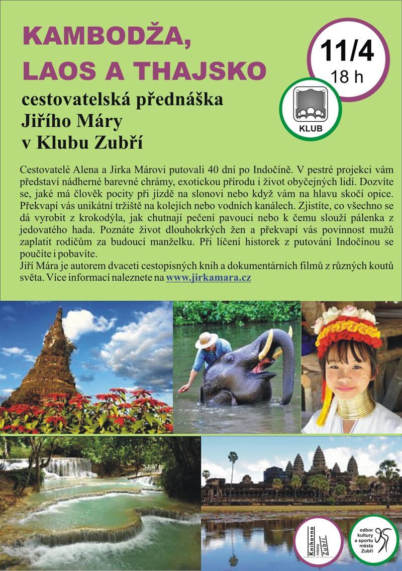 Čtvrtek 11.4.2019 od 18:00 hodin JIŘÍ MÁRA – KAMBODŽA, LAOS, THAJSKO Cestovatelská beseda s promítáním fotografií s oblíbenými cestovateli. Vstupné 50 Kč