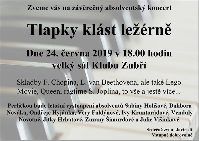 Srdečně zveme naše fanoušky na závěrečný koncert: KLAPKY KLÁST LEŽÉRNĚ Začínáme 24. června v 18:00 hodin ve velkém sále Klubu Zubří. Budeme hrát, zpívat a v závěru koncertu tančit. Taneční číslo na Chorus time předvedou letošní absolventi: Dalibor Novák Julie Višinková Věra Faldýnová Iva Kruntorádová Ondřej Hyjánek Jitka Hrbatová Zuzana Šimurdová Vendula Novotná a Sabina Holišová. Těšíme se na Vás. Vstupné dobrovolné.
