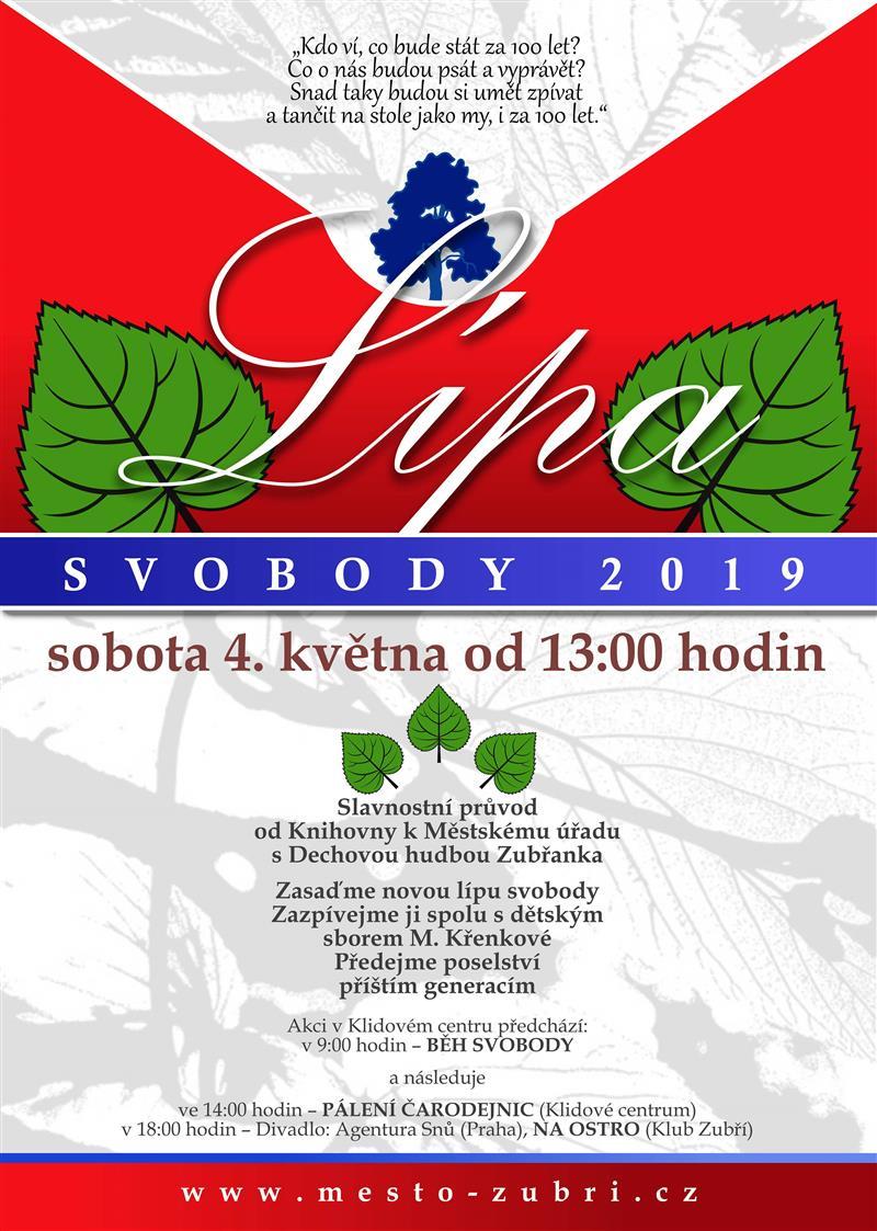 Sobota 4. 5. 2019 od 13 hodin v centru Zubří LÍPA SVOBODY - „ZA 100 LET“ Přesně před 100 let byla v zuberském centru vysazená Lípa svobody. Přijďte nám pomoci vdechnout nový život novému stromu a předat svá poselství příštím generacím. ZAZPÍVEJME LÍPĚ SVOBODY „Kdo ví, co bude stát za sto let, co o nás budou psát a vyprávět…“ Takto se ptá společně třináct různých interpretů na speciální nahrávce „Za 100 let“, která připomíná 100. výročí vzniku republiky. Pojďme prostřednictvím této písně vdechnout život novému stromu symbolizujícímu svobodu. V sobotu 4. května 2019 uplyne přesně 100 let od doby, kdy byla v zuberském centru vysazena Lípa svobody. Jak to tenkrát probíhalo, si můžete přečíst v níže uvedeném přepisu Školní kroniky Dolní školy. Po 100 letech bude v Zubří u Městského úřadu vysazena lípa nová. Přijďte podpořit slavnostní průvod, který povede od knihovny k Městskému úřadu a připomene hodnoty, na které se v této společnosti čím dál více zapomíná. Podpořte dechovo