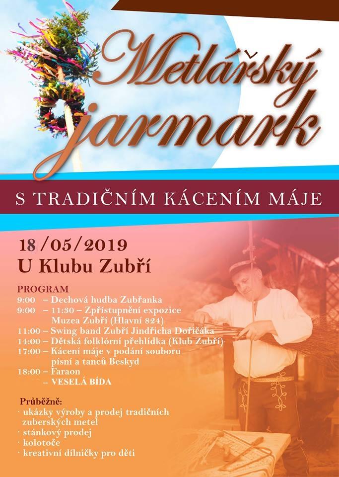 Sobota 18. 5. od 9.00 hodin u Klubu Zubří METLÁŘSKÝ JARMARK S TRADIČNÍM KÁCENÍM MÁJE Tradiční Metlářský jarmark s Dětskou folklórní přehlídkou a kácením máje v podání VSPT Beskyd. Stánkový prodej, řemeslný jarmark, kolotoče a bohatý doprovodný program. K poslechu i tanci hrají: DH Zubřanka, Swing Band J. Dořičáka, Faraon a kapela Veselá bída