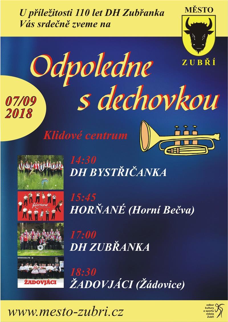 pátek 07.09. od 13:00 hodin ODPOLEDNE S DECHOVKOU OSLAVY 110. VÝROČÍ DH ZUBŘANKA Slavnostní odpoledne a podvečer ve společnosti dechové muziky. Pozvání Dechové hudby Zubřanka přijali DH Bystřičanka, DH Horní Bečva a Žadovjáci.