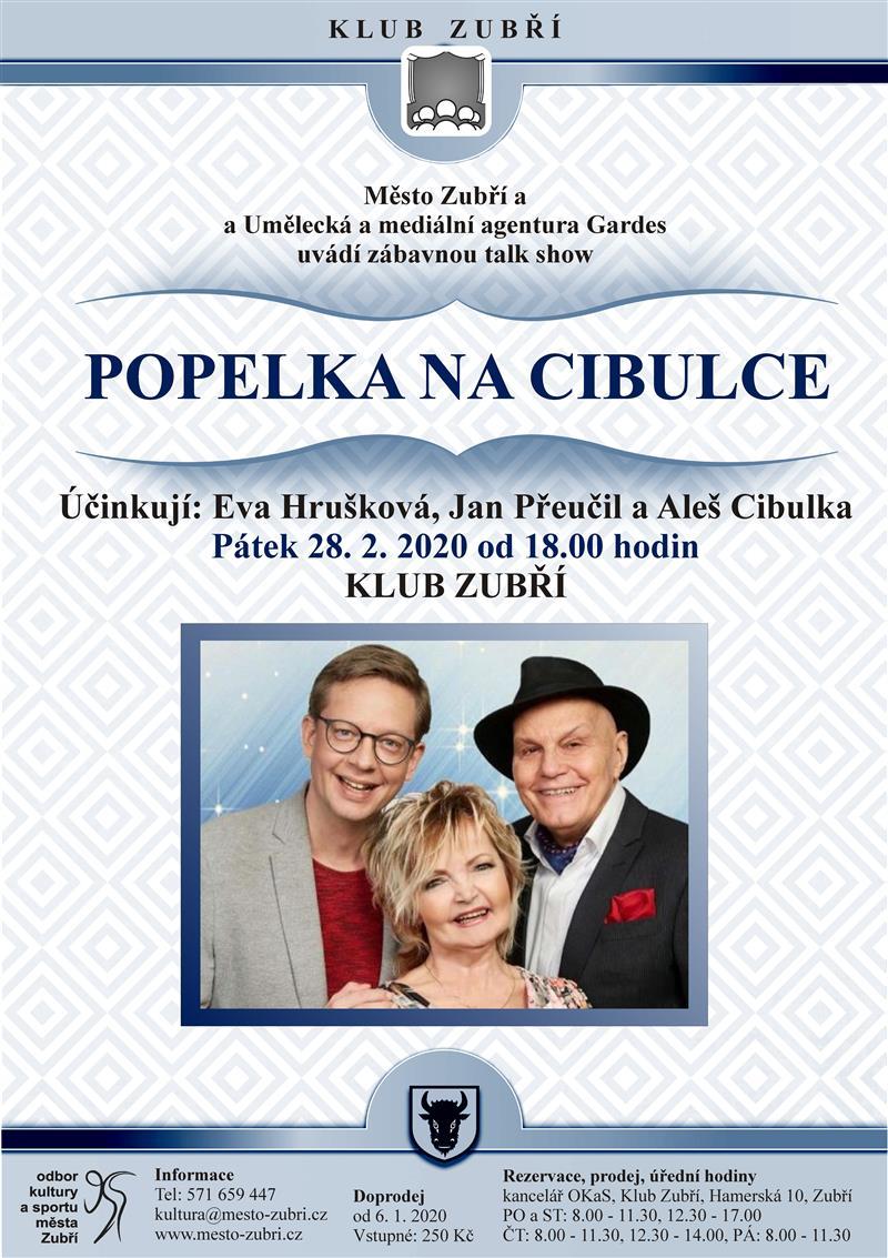 Eva Hrušková a Jan Přeučil v zábavné talkshow Aleše Cibulky Pátek 28. 2. 2020 od 18.00 hodin Vstupné: 250 Kč, Rezervace: od 6. 1. 2020 Letos uplyne přesně 50 let od premiéry televizního zpracování legendární pohádky POPELKA s Evou Hruškovou a Jiřím Štědroněm v titulních rolích. Klenot české pohádkové literární pokladnice zná zpaměti každé malé dítě. Po vlastech českých, moravských i slezských se vydává zábavný pořad plný historek z natáčení, perliček ze zákulisí a veselých historek, spojených s touto legendární pohádkou.