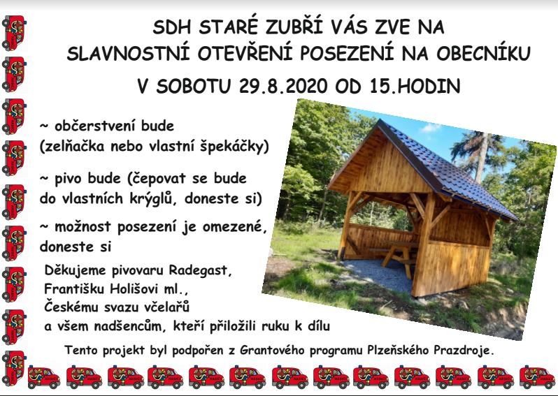 SDH STARÉ ZUBŘÍ VÁS ZVE NA SLAVNOSTNÍ OTEVŘENÍ POSEZENÍ NA OBECNÍKU V SOBOTU 29.8.2020 OD 15.HODIN