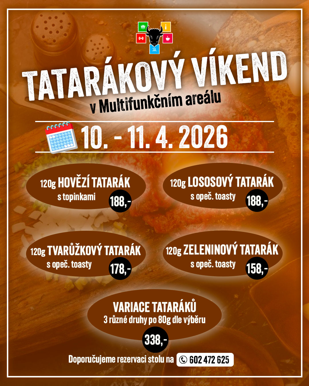 Rozšířená nabídka občerstvení. 4 druhy tataráků. Hovězí, lososový, tvarůžkový a zeleninový.