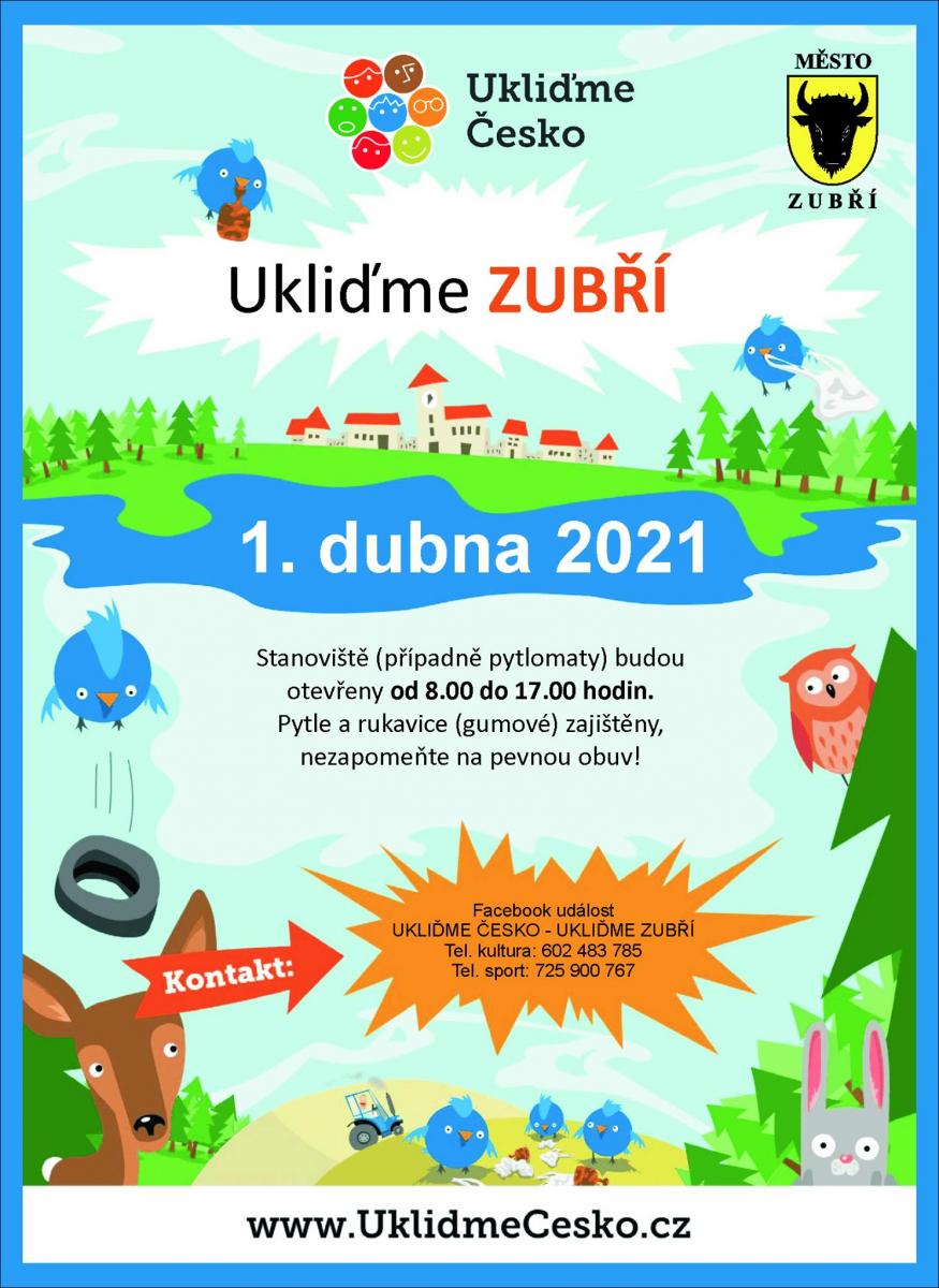 Ukliďme Česko je dobrovolnická úklidová akce, která probíhá na území celé České republiky (a dokonce na pár místech mimo ni). Jejím cílem je uklidit nelegálně vzniklé černé skládky a nepořádek. Město Zubří plánuje podporu této dobrovolnické akce na 1. dubna a v následném prodlouženém víkendu připraví prostředky k úklidu také dalším dobrovolníkům.