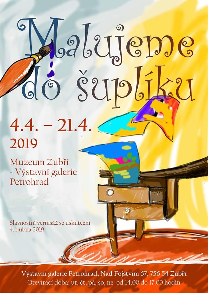 Od čtvrtka 4. 4. 2019 do neděle 21. 4. 2019 VÝSTAVA MALUJEME DO ŠUPLÍKU Vernisáž: čtvrtek 4. 4. 2019 od 16:00 hodin Otevřeno: út, čt, pá, so, ne od 14.00 do 17.00 hodin VSTUPNÉ DOBROVOLNÉ