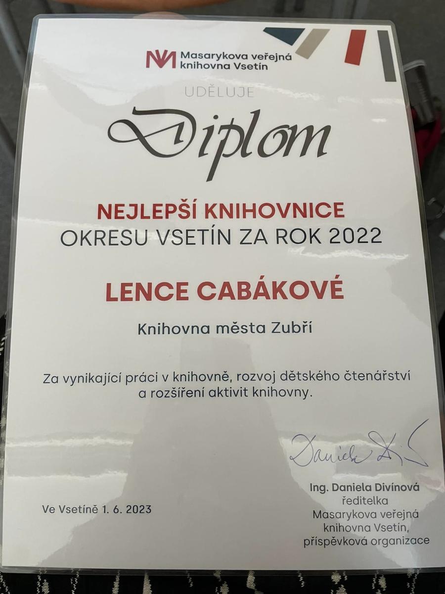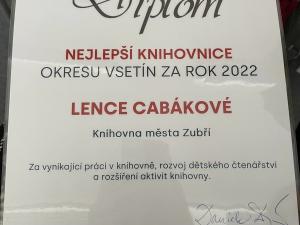 Ve čtvrtek 1. června 2023 v Masarykově veřejné knihovně Vsetín na Setkání knihovníků a starostů proběhlo vyhlášení Nejlepších knihovníků a knihovnic v okrese Vsetín za rok 2022. Toto ocenění si z rukou ředitelky vsetínské knihovny Ing. Daniely Divínové převzala knihovnice Lenka Cabáková. Oceněna byla za vynikající práci v knihovně, rozvoj dětského čtenářství a rozšíření aktivit knihovny.